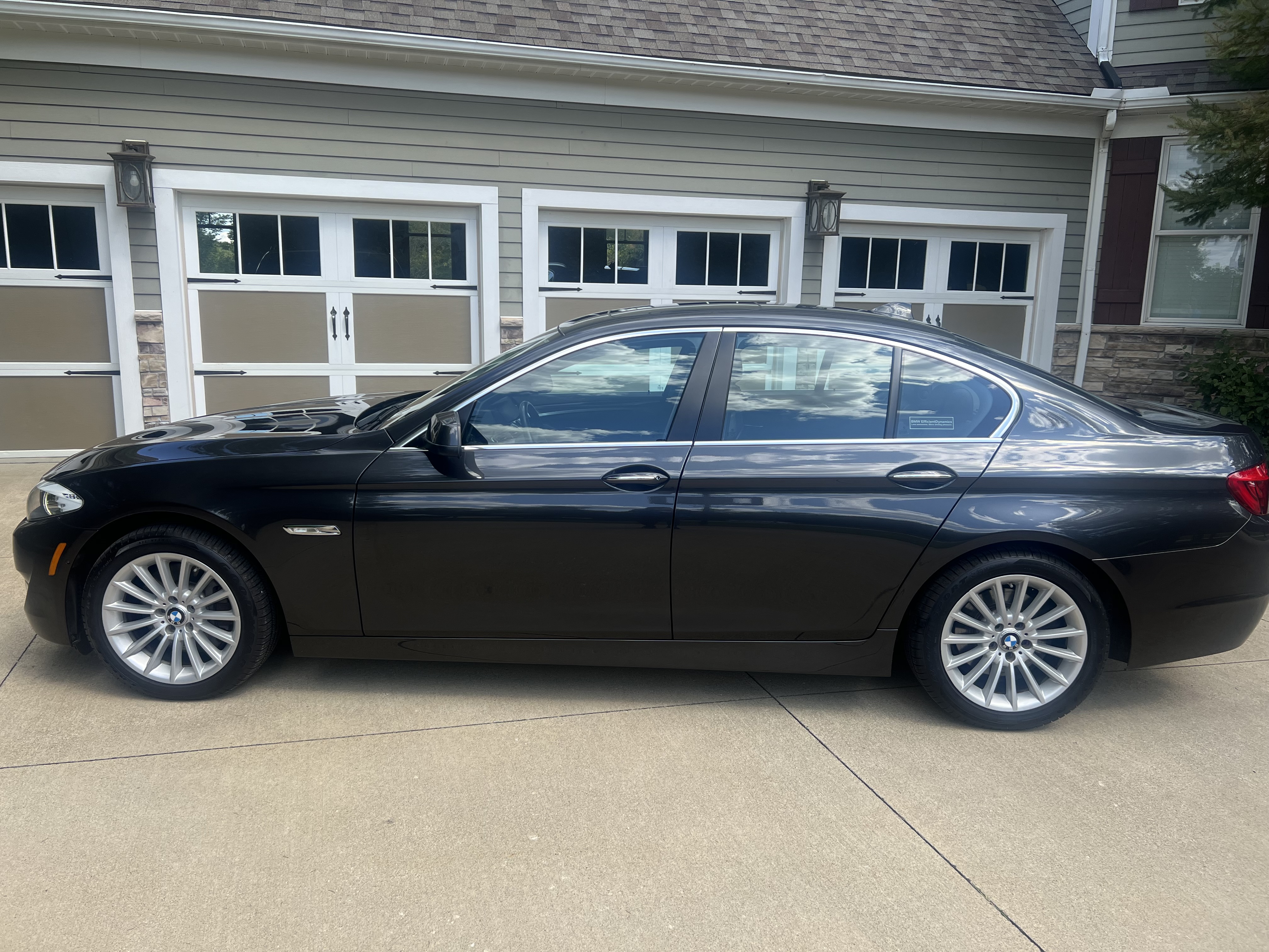 The 5 Series shares its platform with the bigger 7 Series sedan. Up front, the car’s signature kidney grilles sit low and are upright. Adaptive xenon headlights are optional on the 528i and standard elsewhere. The taillights employ three rows of LED lights, and BMW’s Adaptive Brake Lights illuminate a larger section under hard braking. Exterior features include:
